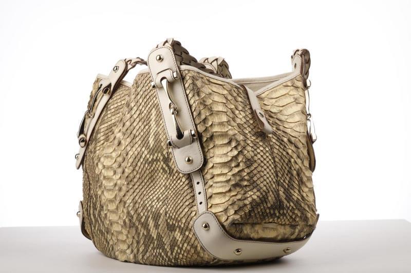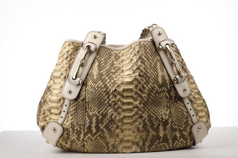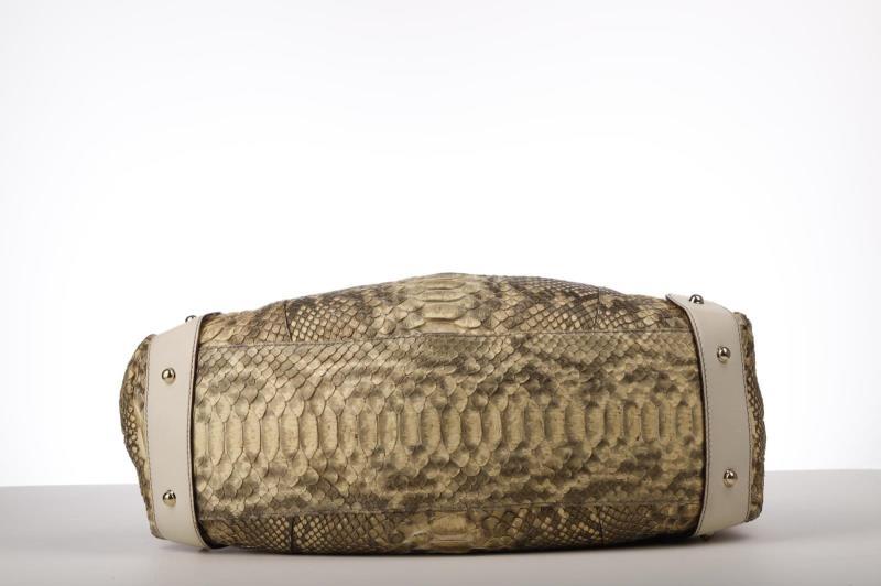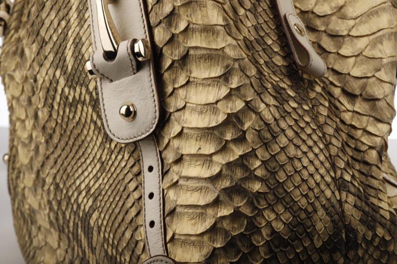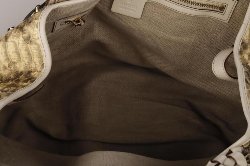 112 - 21 GUCCI NATURAL TONAL PYTHON LINED IN BEIGE CANVAS WITH POLISHED BRASS PALLADIUM