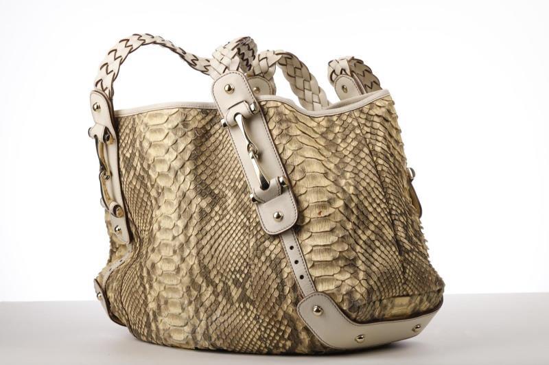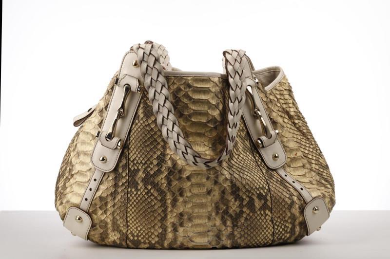 This chic tote is beautifully crafted of fine natural tonal Python. The bag features Leather straps with braided detailing and polished brass hardware. Lined in beige canvas.