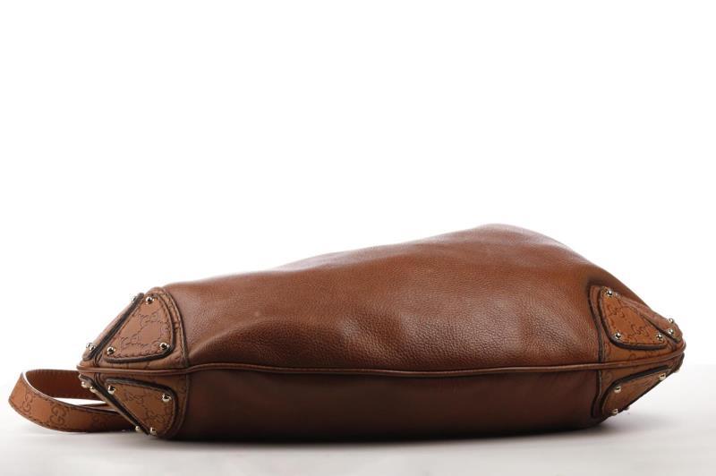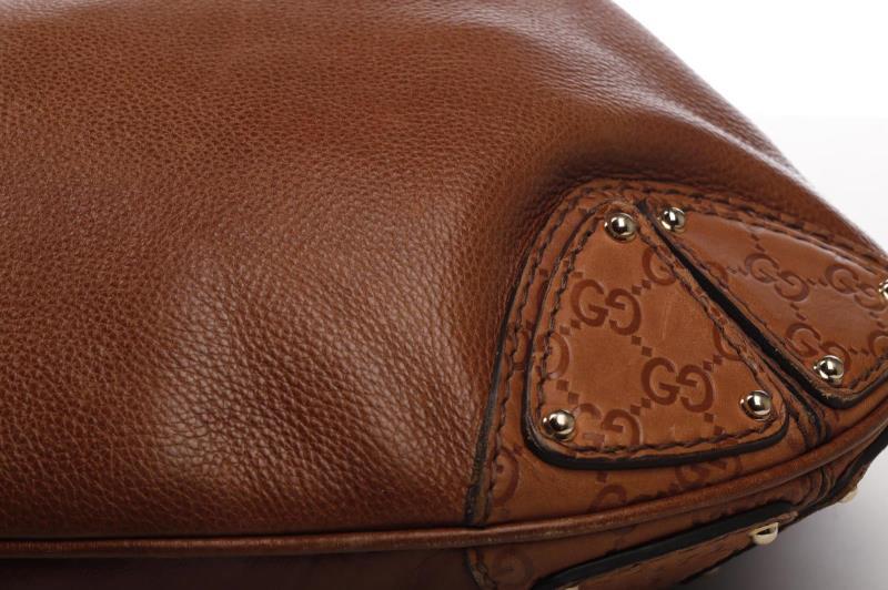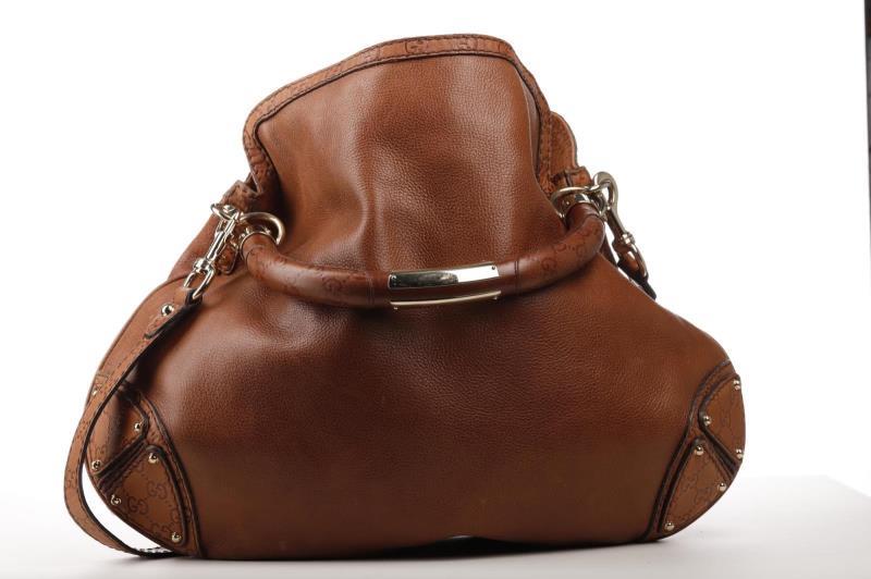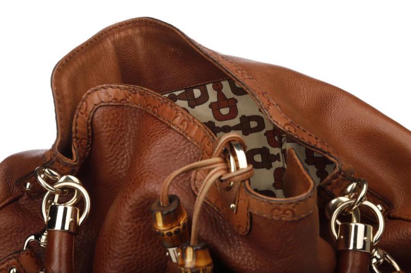 This Gucci top handle bag is crafted in brown Leather. The GG monogram is crafted on the corners of the bag and the bamboo endorsement on the tassles gives the bag an exotic look. The bag closes without any zip nor buckle thanks to the big tassles. These tassles are finished with a Gold stud. The interior of the bag features two side compartments. It comes with an extra removable shoulder strap with the gucci monogram. This allows you to hang it around easily as well as use it as a cross bag.