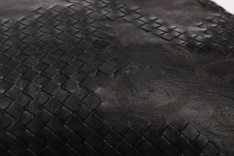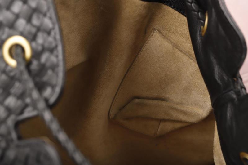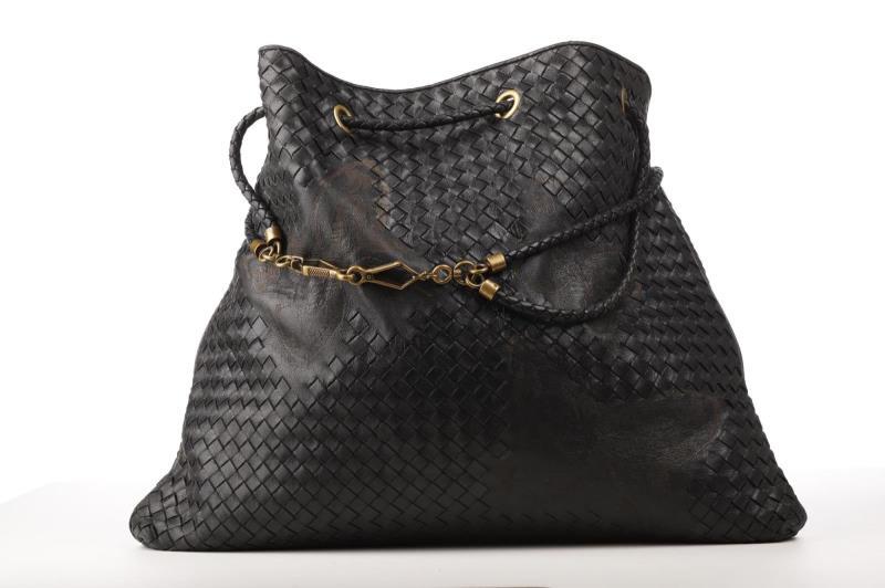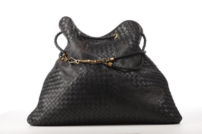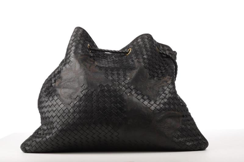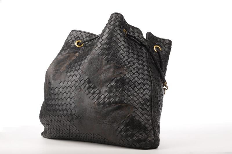 Intrecciato nappa Leather with aged Gold tone hardware. Shoulder strap with double lobster clasps and open top. Embossed butterfly details. One zipper pocket, 1 slip pocketDebossed designer lettering.