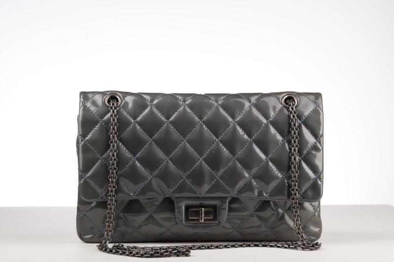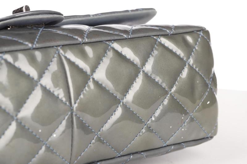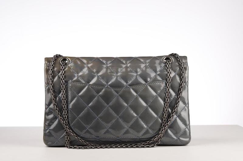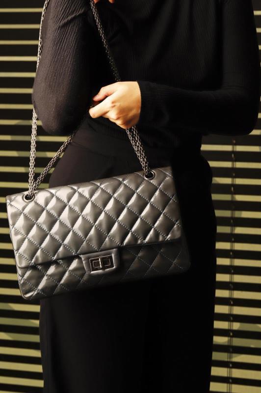 The color of this metallic green Chanel bag is Limited edition. On the front, a mademoiselle clasp in gunmetal silver. This is the clasp that Coco Chanel always used. By now it is customary for all bags representing the 2.55 -and having the mademoiselle clasp- to be called that. In the top flap there is a zipper. The second flap closes with a press stud and has a large embroidered CC logo on the inside. Then two compartments, in the larger one two more side pockets. The inside of the bag is in the same color as the outside. On the back another stitched-on compartment, this is the so-called 'half moon pocket'.