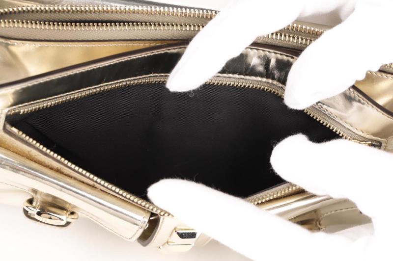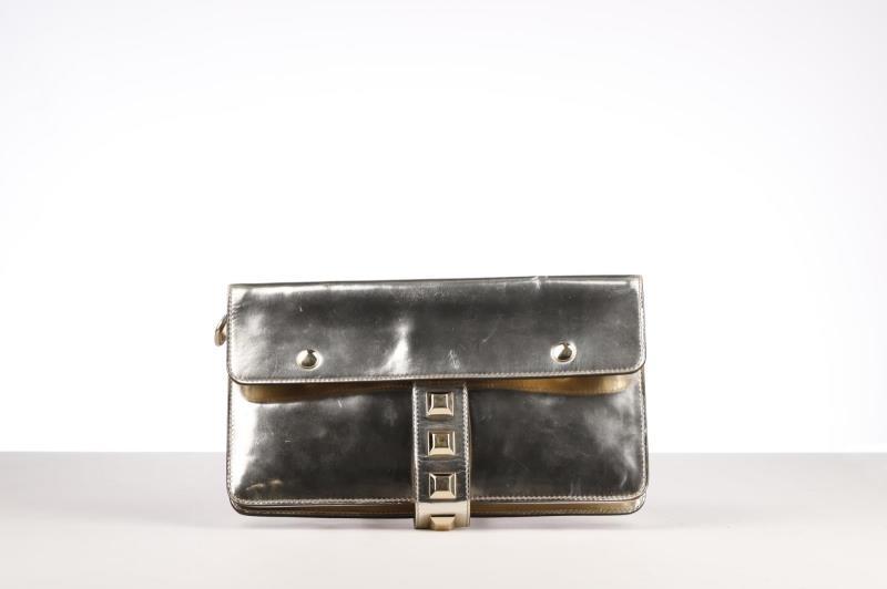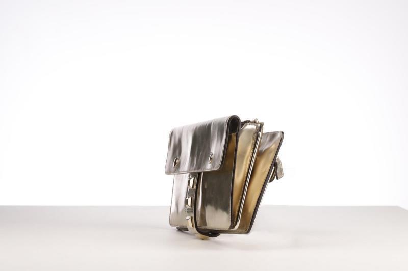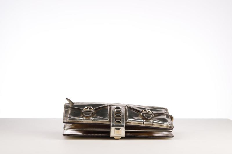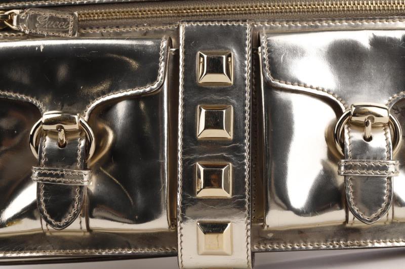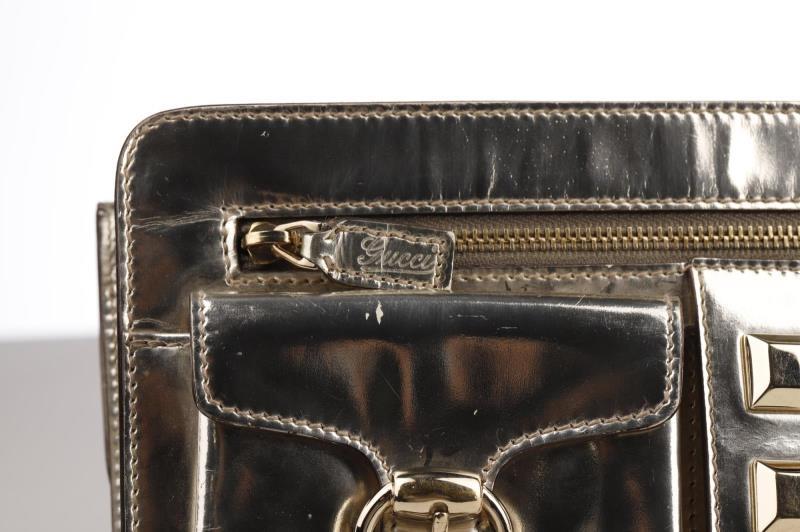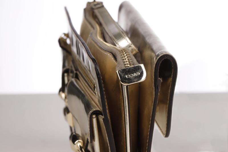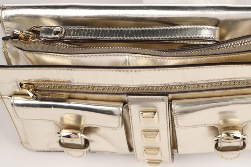 This Gucci clutch in metallic Gold tone is a real eye-catcher. It has a zipper in the front and two pockets with a buckle. It is finished with studs and Gold tone hardware. In the middle there is a handle and a storage pocket that you can open and close with a zipper. On the back there is also a storage compartment that you can close with two push buttons.