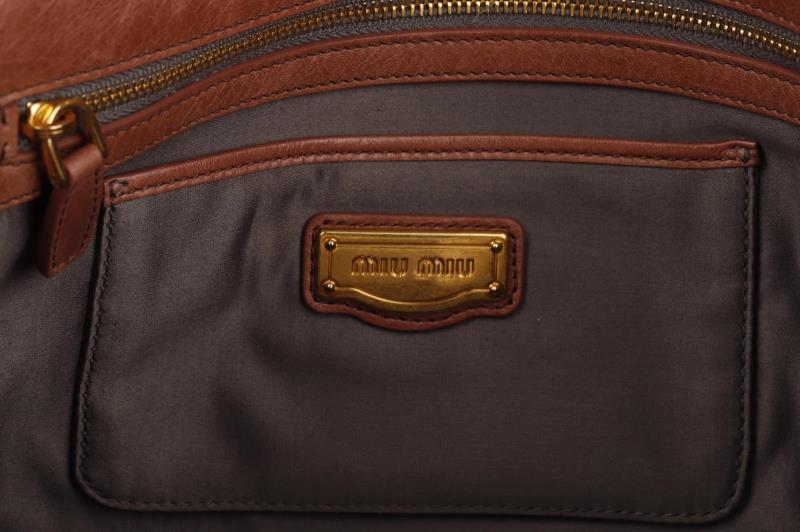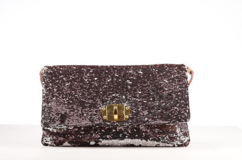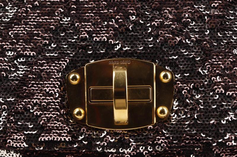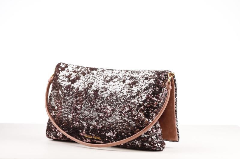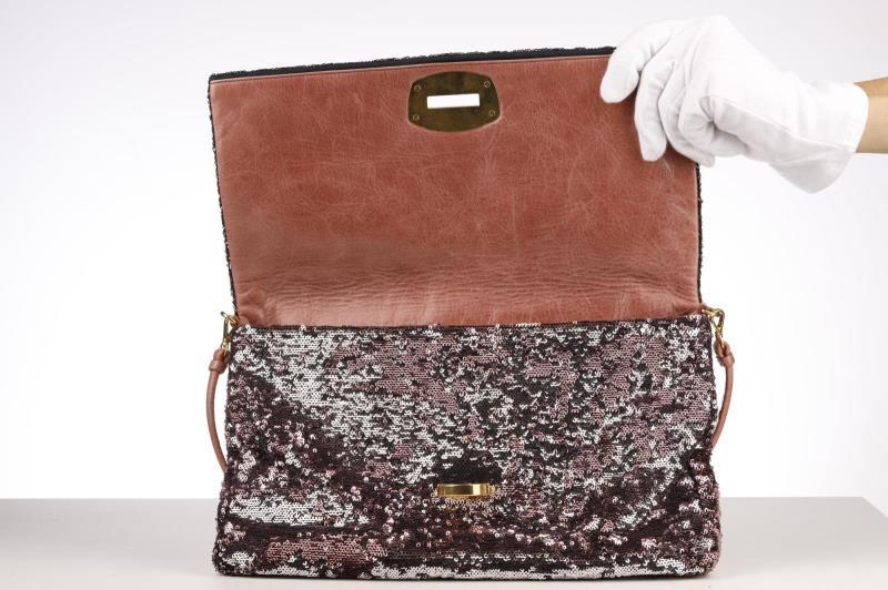 This cute bag from MIU MIU is finished with delicate rose and silver coloured sequins. The logo and trim is in Gold color. It has a brown Leather shoulder strap that you can remove. So you have the choice to wear it as a clutch or shoulder bag. Inside, the bag is finished with rose Leather and grey fabric. It has two extra storage compartments including one with zipper closure.