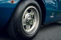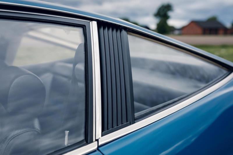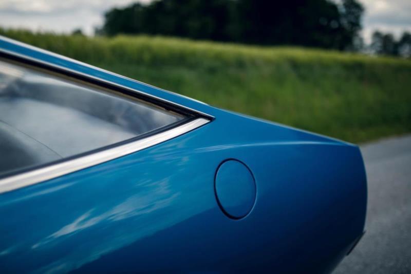 With its wedge shape, the retractable headlights and the five-spoke wheels, the GTC/4 reminded much more of the sporty 365 GTB/4 Daytona and looked way more exotic than its predecessors 365 GTC and 365 GT 2+2. The front end is marked by a matte black synthetic resin noseband that replaces the bumper, and the at that time most modern retractable headlights. Unlike the Daytona the GTC/4 had been designed with the retractable headlights in the first place, so these are fully integrated. The bonnet and the wings run smoothly up to the cabin. The roof line comes down to the low rear end with its pair of triple lights, which in total shapes the characteristic, wedged profile.