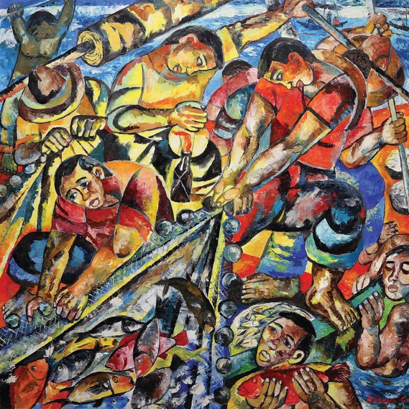 115 - 170 Norma Belleza (b. 1939) - Fishermen Signed signed and dated 1992 (lower right) Medium oil on canvas Size 48” x 48” (122 cm x 122 cm) Add favorite Share