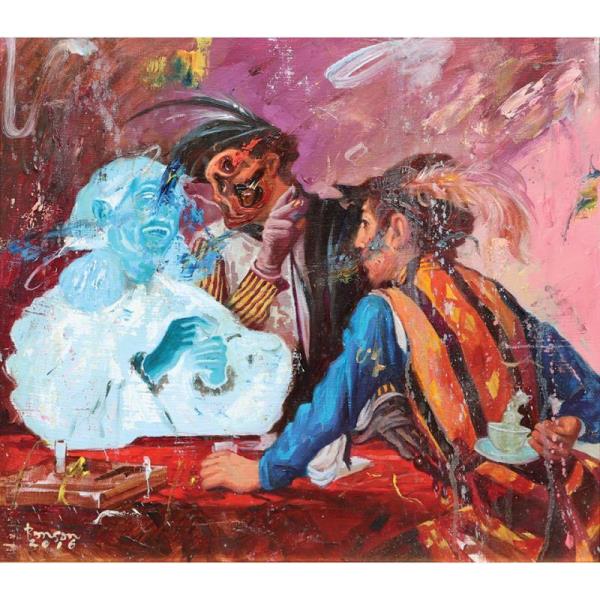 114 - 46 Ronson Culibrina (b. 1991) - Spasmodic Laughs and Gossips Signed signed and dated 2016 (lower left) Medium oil on canvas Size 14” x 16” (35 cm x 40 cm) Add favorite Share