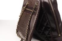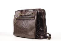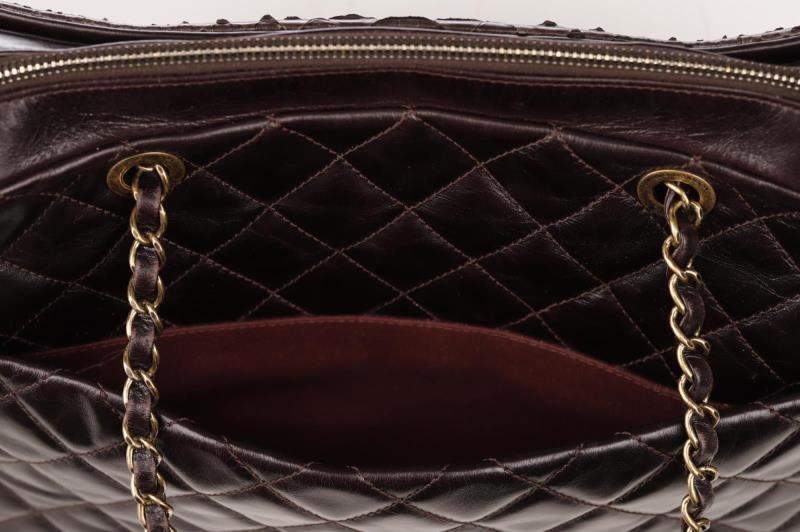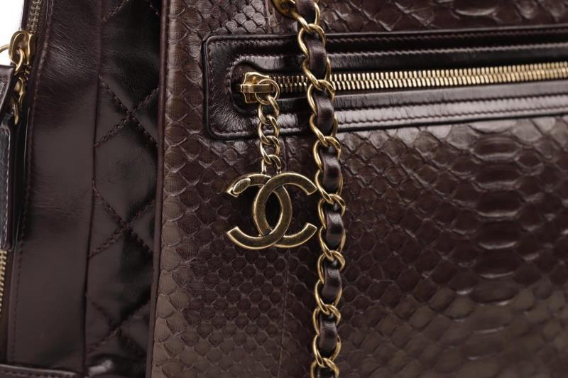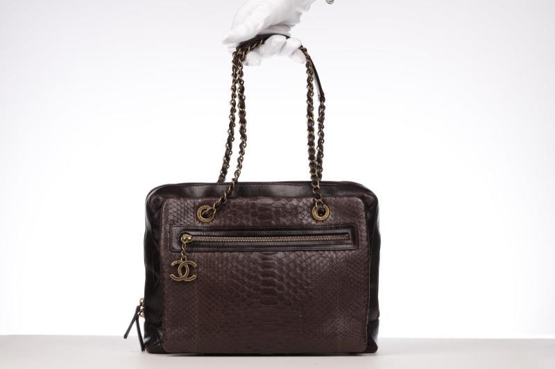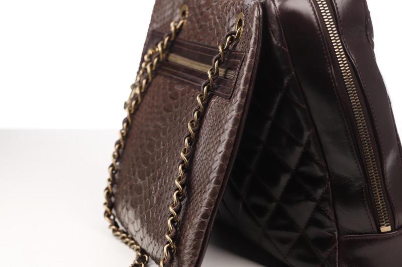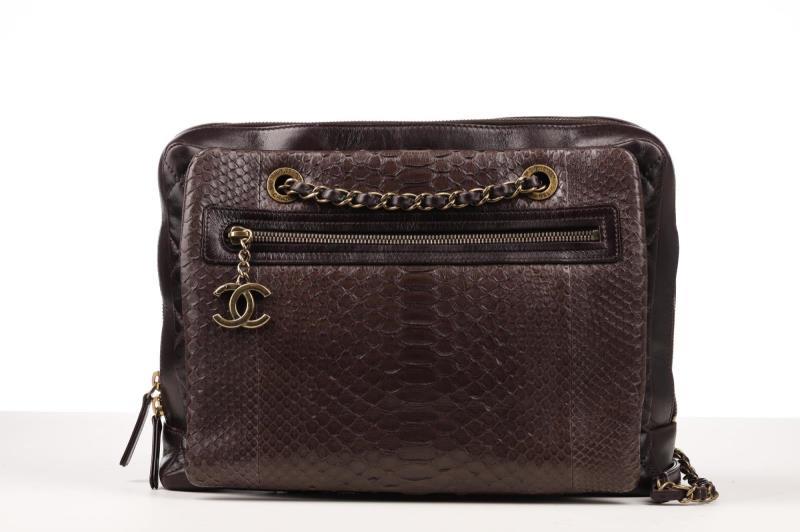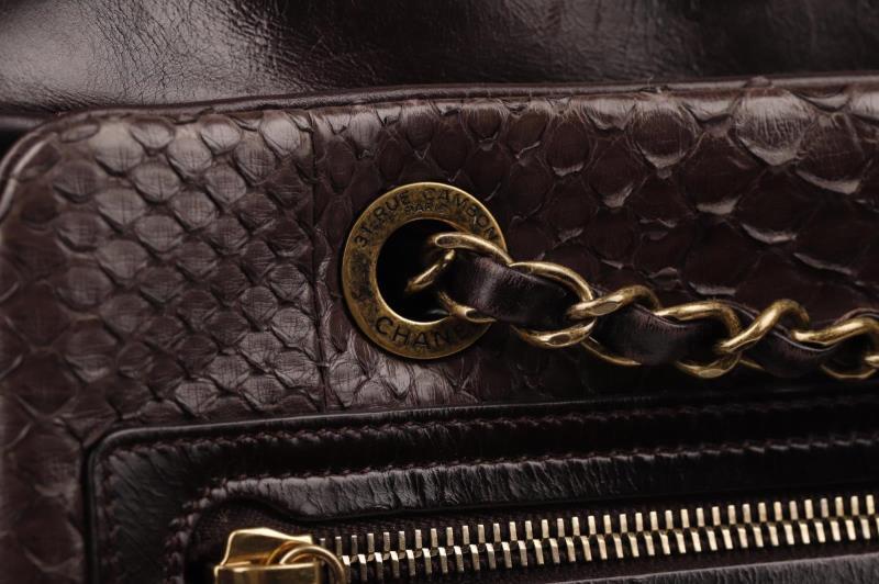 A very exclusive Handbag with Python Leather. It has a brown/bordeaux color and a Gold-tone hardware. the bag has a on the outside two storage compartments one with zipper and an open pocket. Zipper to close the bag. Inside, the bag is finished in Bordeaux fabric and it has a large zippered storage area and two pockets. At the bottom of the corners there are slight traces of use. Chanel no longer makes Python bags.