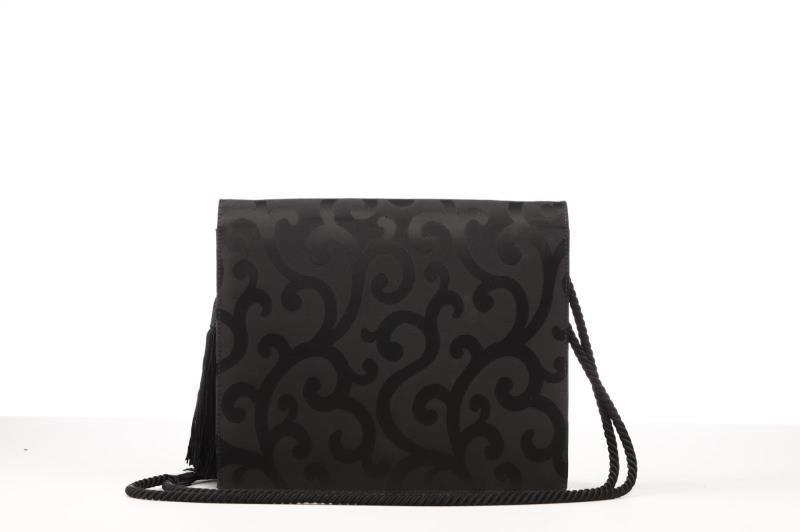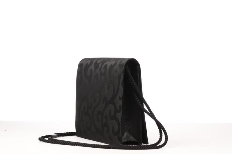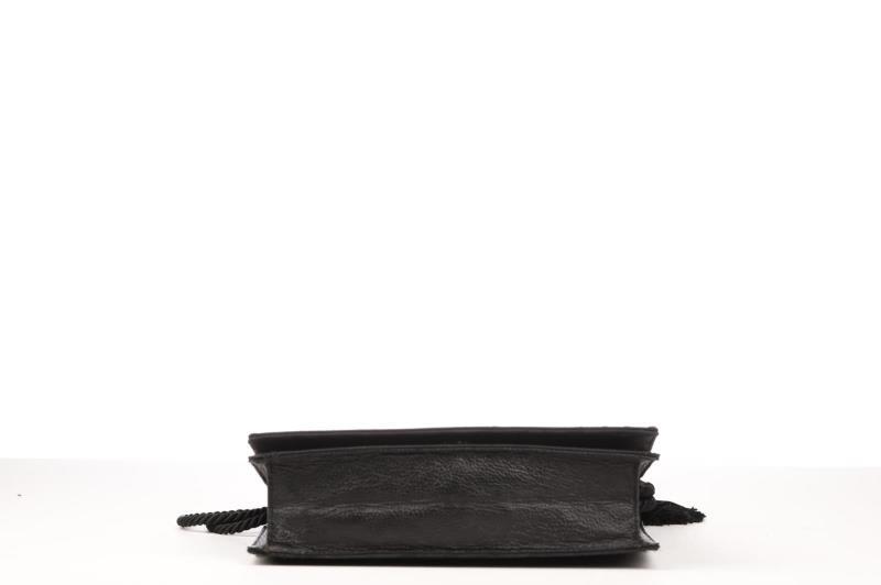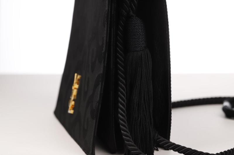 This Vintage Yves Saint Laurent envelope bag with Gold-tone YSL logo is an excellent evening bag. You can close it with a push button and is finished with Gold hardware. It is made of fabric with a two-tone pattern. Inside, the bag is also finished in the same fabric and it has an extra storage area with zipper closure. It has a woven double shoulder strap of 125 cm and it is finished with a beautiful floss.