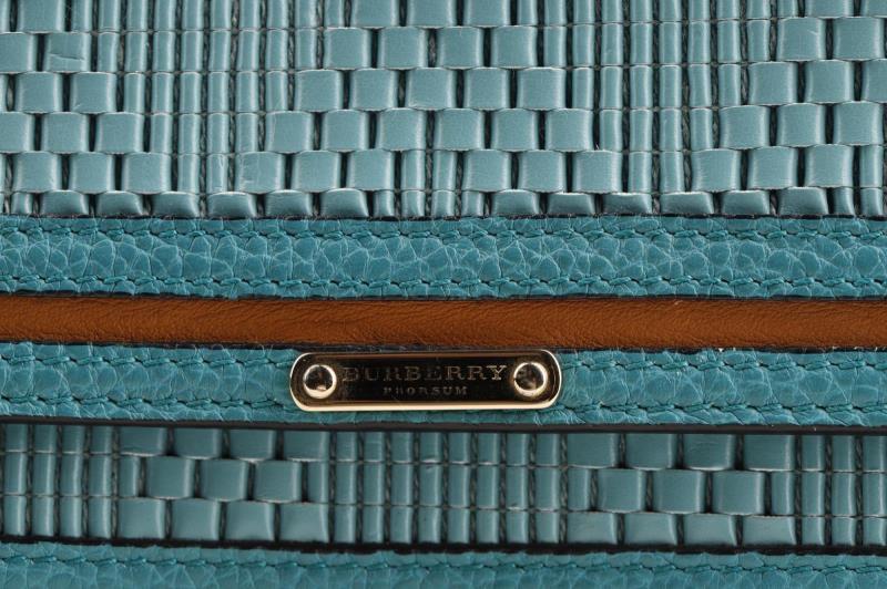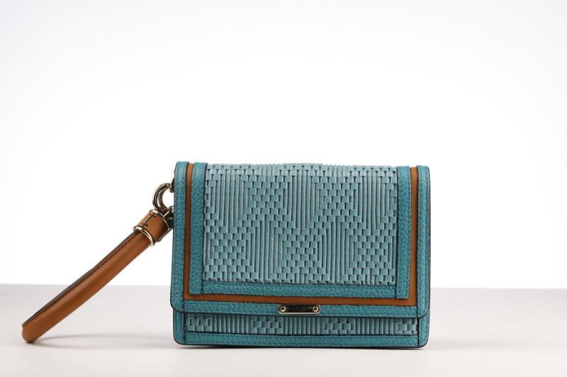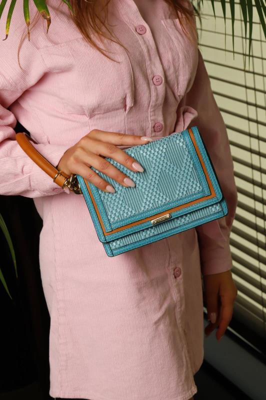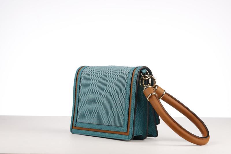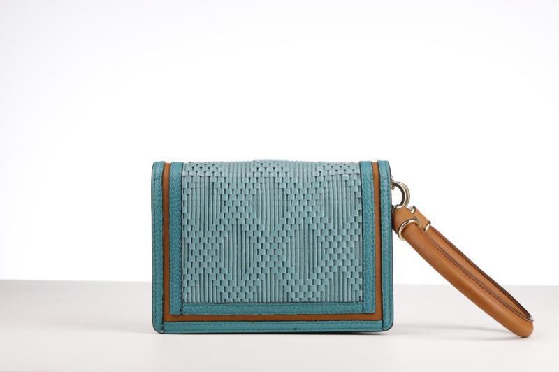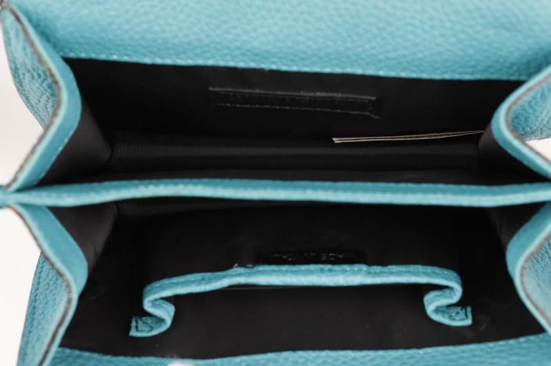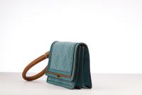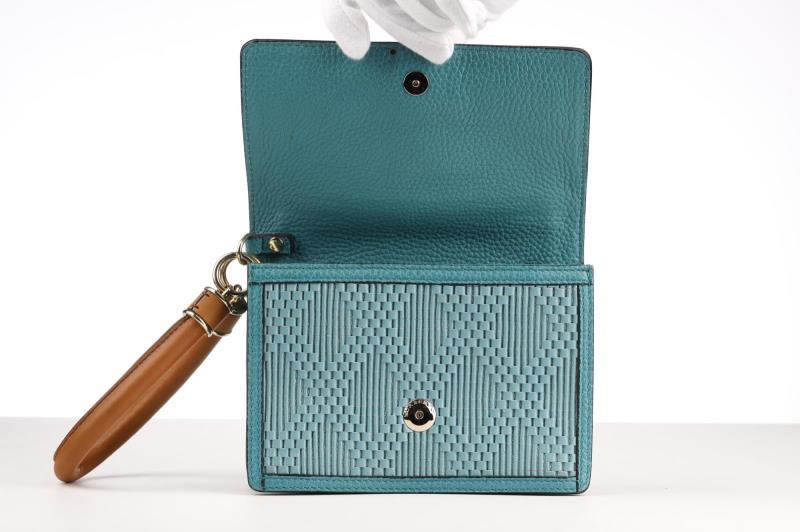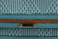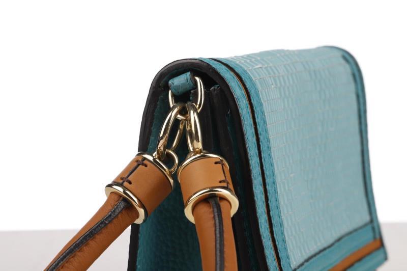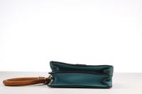 This turquoise bag with brown colored details and Gold hardware is a real eye catcher for the summer. At the front it has a logo plaque. You can easily wear the bag around your wrist by the wrist band. The bag opens and closes by using a push button. Inside the bag is finished with Leather and fabric. It has three storage compartments.