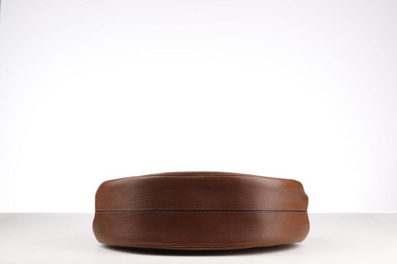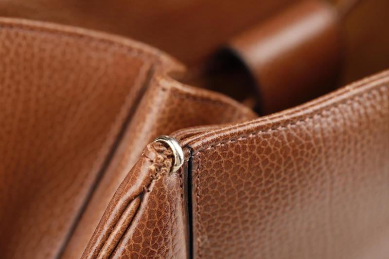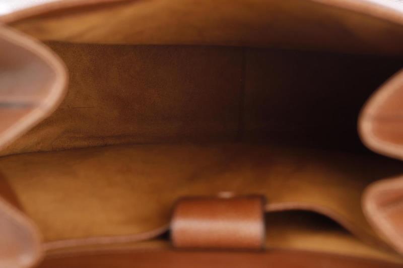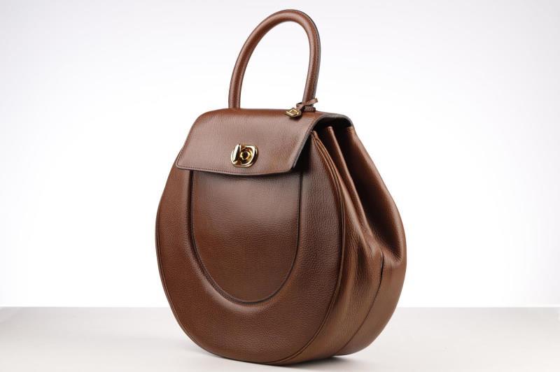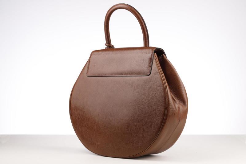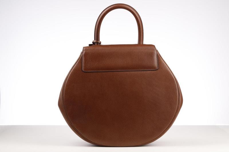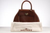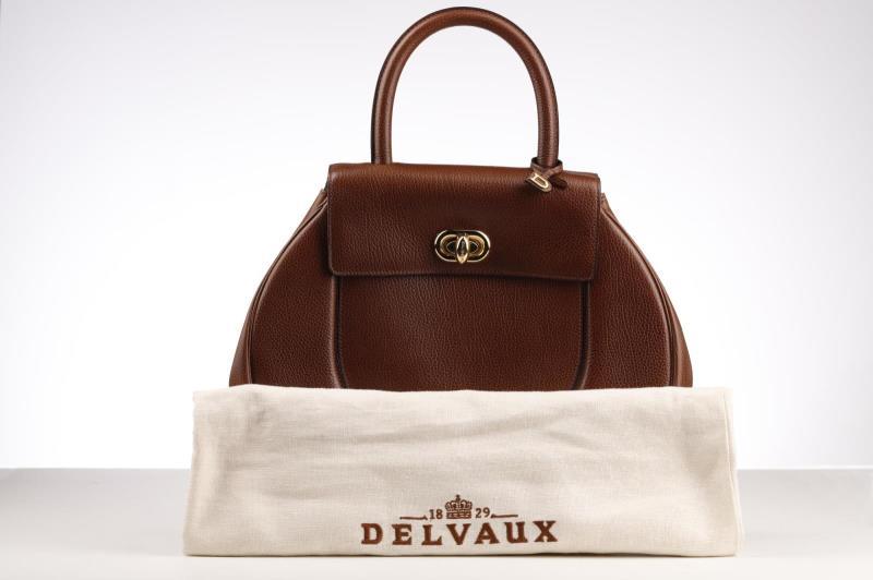 he exterior is made out of beautiful brown Leather which gives it that hint of luxury that Delvaux adores. This beautiful round model opens and closes with a Gold-coloured turn lock with the name Delvaux on it. There is also a small D on the handle. Inside the bag is fagewrrkt with brown suede and has a storage compartment that can be closed with a push button.
