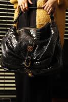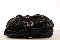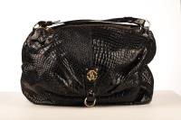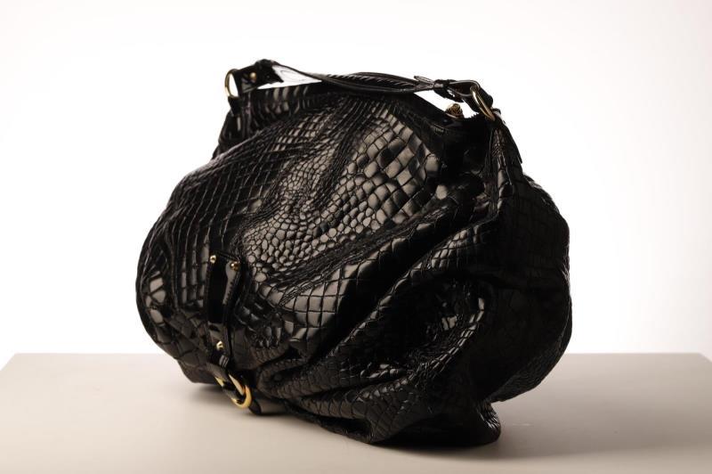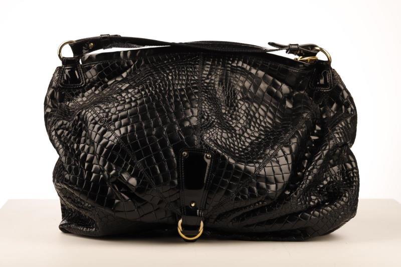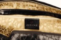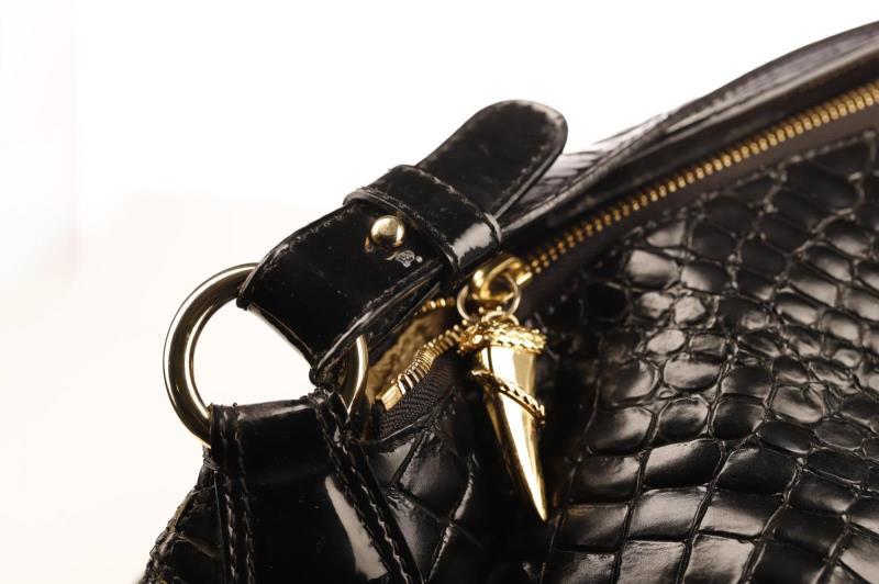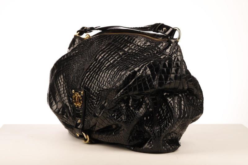 This Roberto Cavalli crocodile embossed bag can be transformed from a medium size bag to a large shoulder bag by unlocking the clasp. The bag has gold hardware and has a tooth pendant on the zipper. The expandable and spacious interior is in beige leopard fabric and has a side pocket to store your essentials.