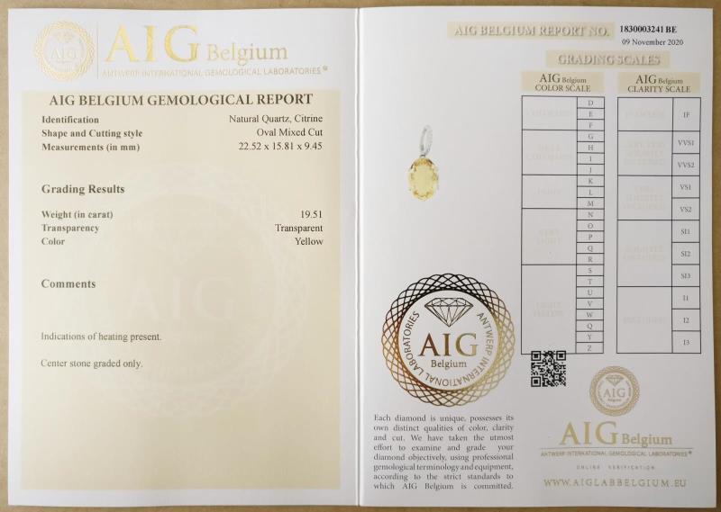 With AIG Certificate No. 1830003241BE - Material: 18 kt. White Gold - Gross Weight: 8.30 grams - Measurements: Necklace: 420 mm Pendant: 41x16x10 mm Main Stone: Citrine - Shape: Oval Mixed Cut - Total Carat Weight: 19.51 cts. - No. of Stones: 1 - Color Grade: Yellow - Treatment: Commonly treated Side Stones: Diamond - Shape: Round Brilliant Cut - Total Carat Weight: 0.18 cts. - No. of Stones: 9 - Color Grade: F - Clarity Grade: VS-SI - Treatment: Natural (untreated) - Made in Belgium - Estimated Retail Value: EUR 1820 Notes: - Natural gemstones and diamonds often have inclusions. Gemstones and diamonds are commonly treated to enhance colour or clarity. This has not been researched for this item unless otherwise mentioned. The diamonds have not been specifically tested whether they are naturally mined or lab grown unless otherwise mentioned. - Please note that some of the images are zoomed in. Please refer to the measurements for actual size Shipping and Delivery information: - Free insured shipping within the EU with track and trace - Free Ring size change if required - Jewels are shipped in a gift box