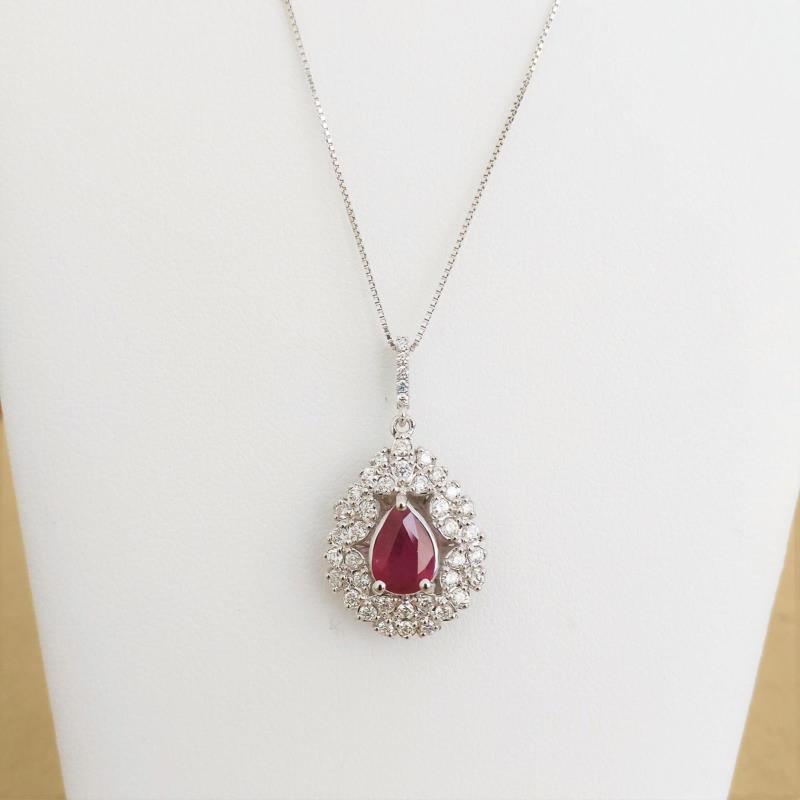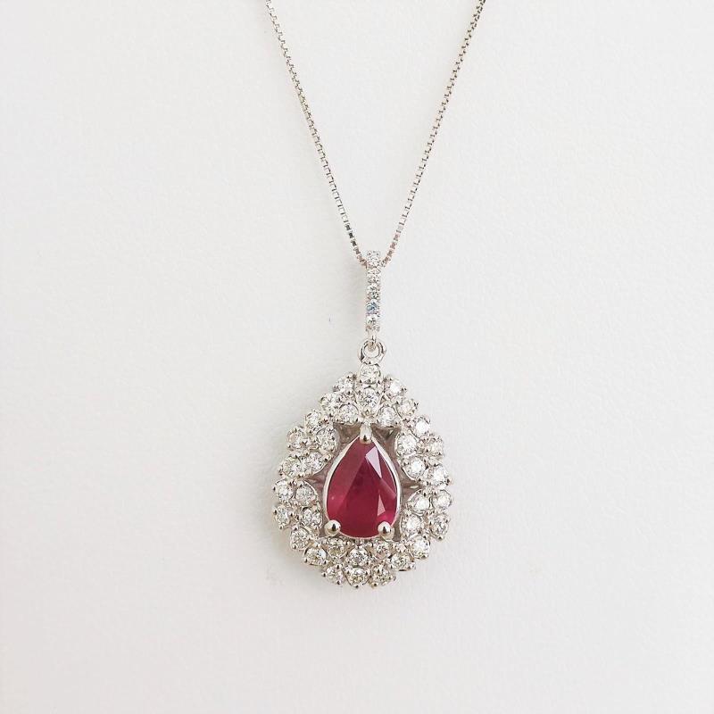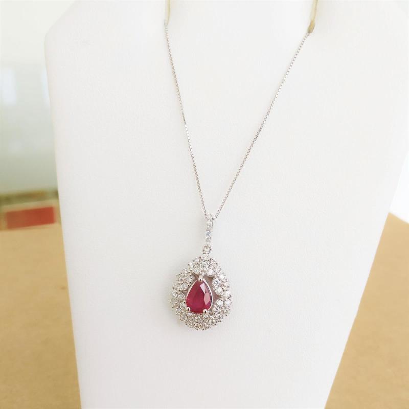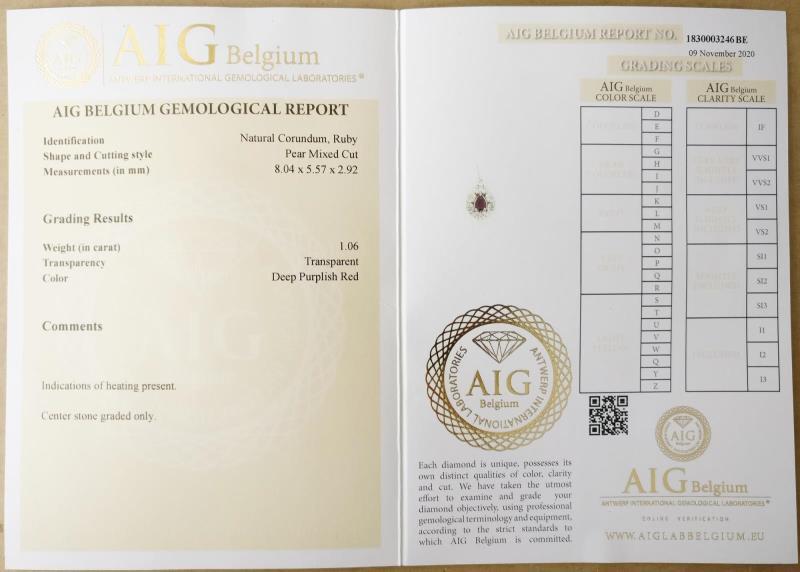 With AIG Certicate No. 183000246BE - Material: 18 kt. White Gold - Gross Weight: 4.40 grams - Measurements: Necklace: 400 Pendant: 27x14x6 mm Main Stone: Ruby - Shape: Pear Mixed Cut - Total Carat Weight: 1.06 cts. - No. of Stones: 1 - Color Grade: Deep Purplish Red - Treatment: Indications of heating present Side Stones: Diamond - Shape: Round Brilliant - Total Carat Weight: 0.59 cts. - No. of Stones: 42 - Color Grade: F - Clarity Grade: VS-SI - Treatment: Natural (untreated) - Made in Belgium - Estimated Retail Value: EUR 2460 Notes: - Natural gemstones and diamonds often have inclusions. Gemstones and diamonds are commonly treated to enhance colour or clarity. This has not been researched for this item unless otherwise mentioned. The diamonds have not been specifically tested whether they are naturally mined or lab grown unless otherwise mentioned. - Please note that some of the images are zoomed in. Please refer to the measurements for actual size Shipping and Delivery information: - Free insured shipping within the EU with track and trace - Free Ring size change if required - Jewels are shipped in a gift box