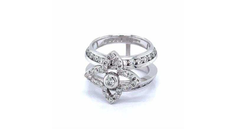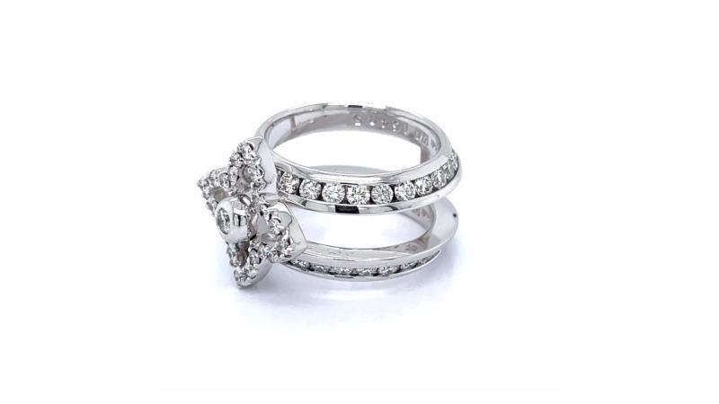 Fancy Flower Diamond Ring platinum double row , Ring size 52 with 21 brilliant diamonds on flower and 1 central brilliant diamond 0,05cts . 28 brilliant diamonds on each row of approx 0,04 cts each. Total carat weight of diamonds approx 2,37 cts and total Ring weight 12,698 grs. Inscription in Ring "16485".