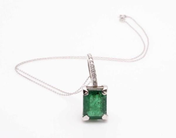 Material: 18 kt. White Gold - Gross Weight: 7.79 grams - Measurements: Necklace: 400 mm Pendant: 31x12x9 mm Main Stone: Emerald - Certificate: ALGT 33666005 - Shape: Emerald Step Cut - Total Carat Weight: 7.70 cts. - No. of Stones: 1 - Color Grade: Deep Green - Treatment: Oiled Side Stones: Diamond - Shape: Round Brilliant Cut - Total Carat Weight: 0.20 cts. - No. of Stones: 10 - Color Grade: F - Clarity Grade: VS-SI - Treatment: Natural (untreated) - Made in Belgium - Estimated Retail Value: EUR 2900 Notes: - Natural gemstones and diamonds often have inclusions. Gemstones and diamonds are commonly treated to enhance colour or clarity. This has not been researched for this item unless otherwise mentioned. The diamonds have not been specifically tested whether they are naturally mined or lab grown unless otherwise mentioned. - Please note that some of the images are zoomed in. Please refer to the measurements for actual size Shipping and Delivery information: - Free insured shipping within the EU with track and trace - Free Ring size change if required - Jewels are shipped in a gift box