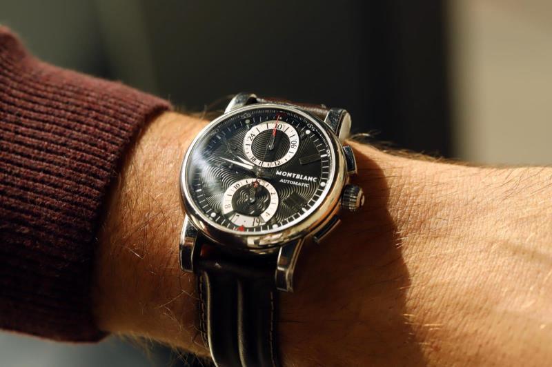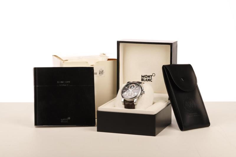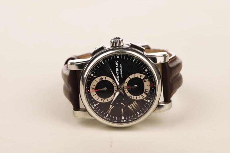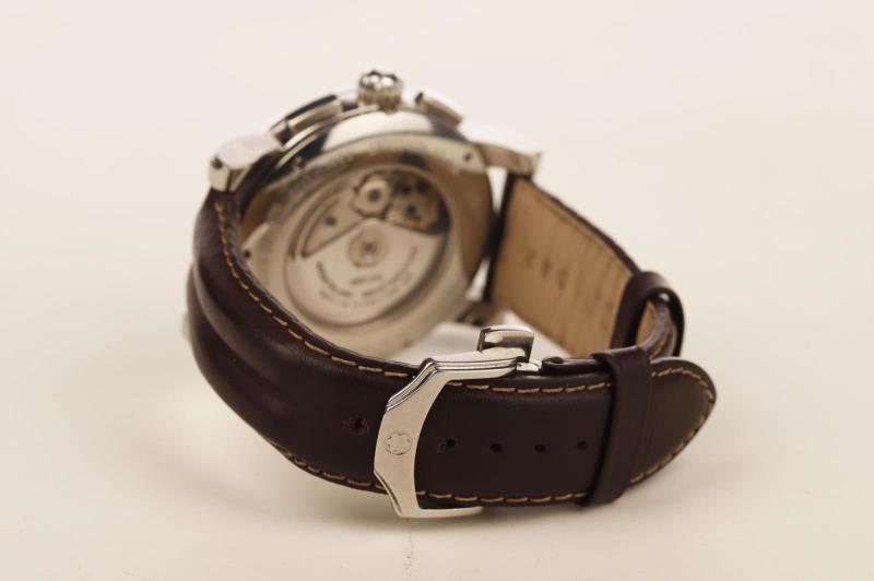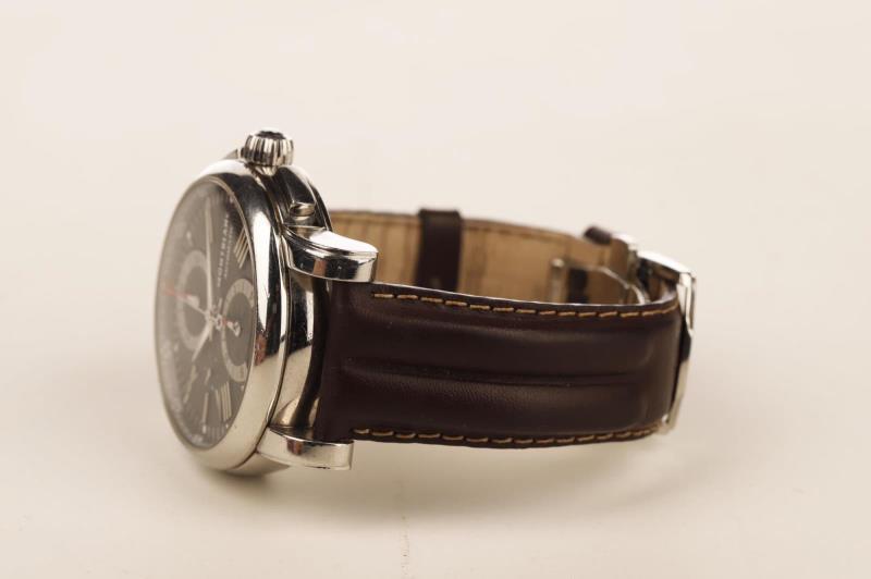 The Montblanc 4810 collection superbly blends functionality and masculine elegance and is aimed at the modern traveler. This wristwatch, which combines performance and craftsmanship, is equipped with a precise self-winding caliber MB 25.07 movement with double push-button chronograph, a bold case of generous proportions and a dial with such a practical and harmonious layout. The black dial is adorned with a guilloché motif representing concentric stars in reference to the Montblanc emblem and applied rhodium-plated indexes and Roman numerals. The date is indicated at 6 o'clock by a red triangle. The regatta hour and minute hands in the center are coated with Super-LumiNova and provide excellent visibility in the dark. For precision chronometry, the minutes are displayed around the edge of the dial is supplemented by a 30 and a 60 in red. The 43 mm diameter stainless steel case, characterized by straight lugs and a thin bezel with a satin-brushed border, is mounted on a black alligator leather strap.