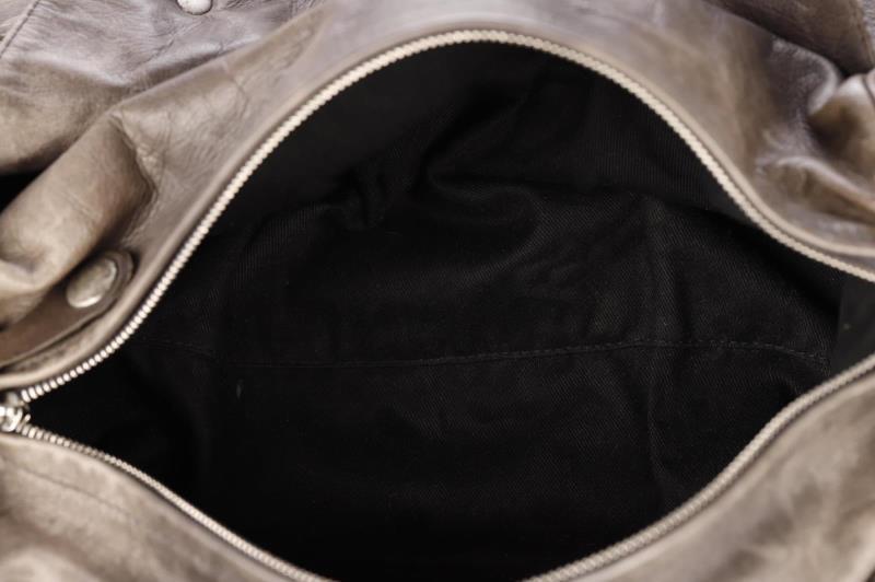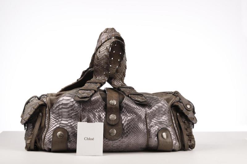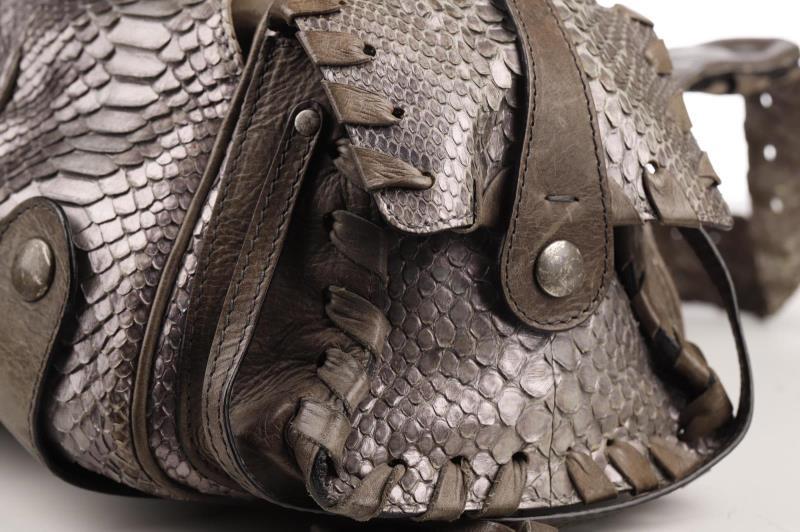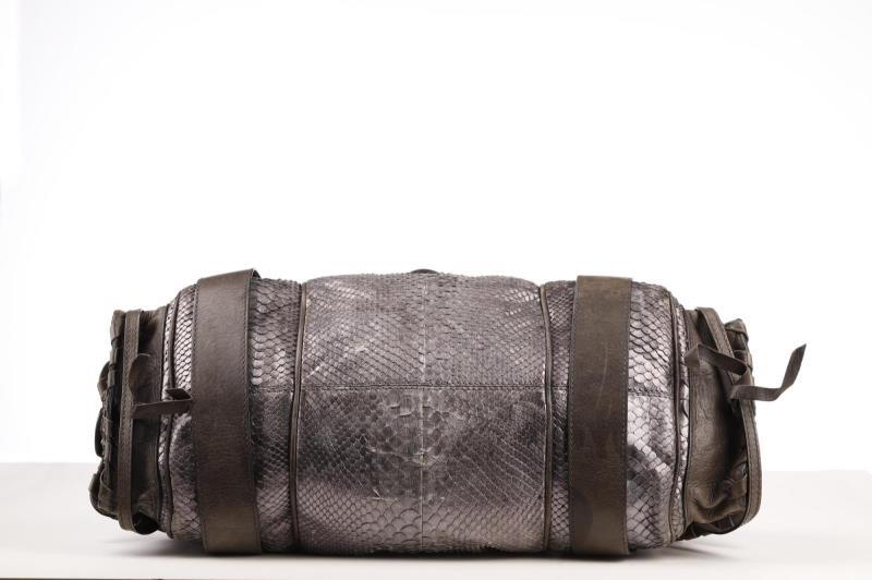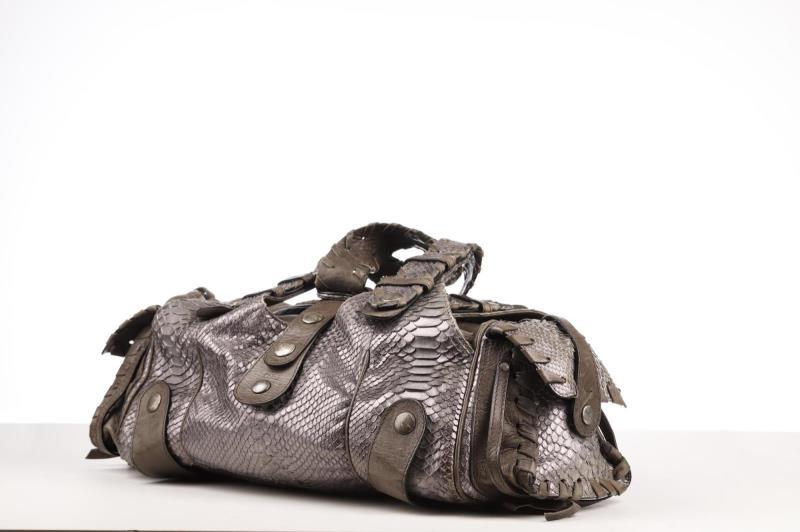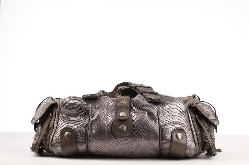 This bag has two shades of Python (grey, silver grey) and grey Leather, with a black canvas interior. The bag can be carried over the shoulder, over the arm or by hand. Underneath the zipper there is a large compartment, on both sides there are two smaller pockets as well for maximum storage. The refinement of this bag is truly remarkable and the studs give it a tough look.