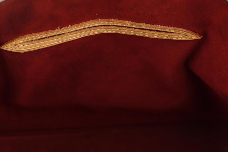 The Goldtone hardware has surface scratches, but is still bright. The interior is clean and is in great condition. Some darker spots on the handles.