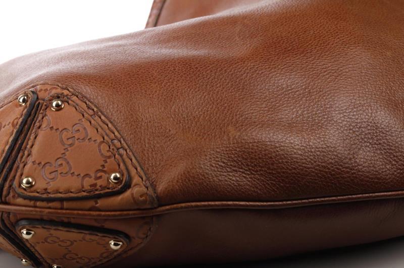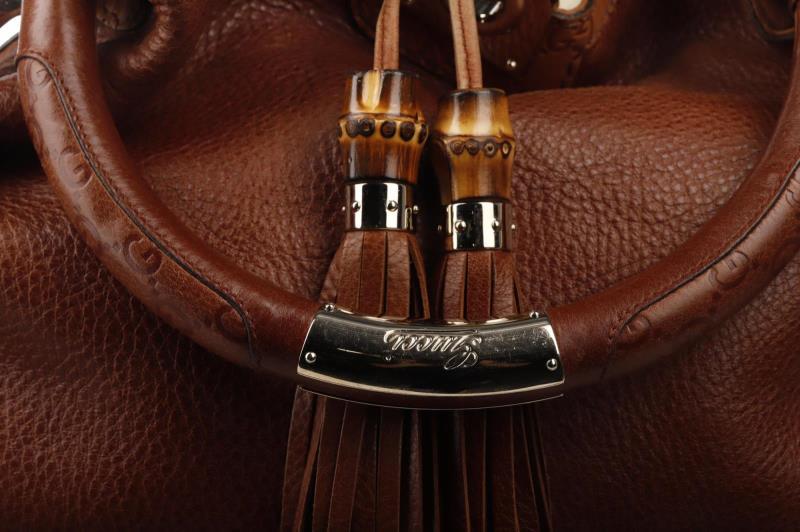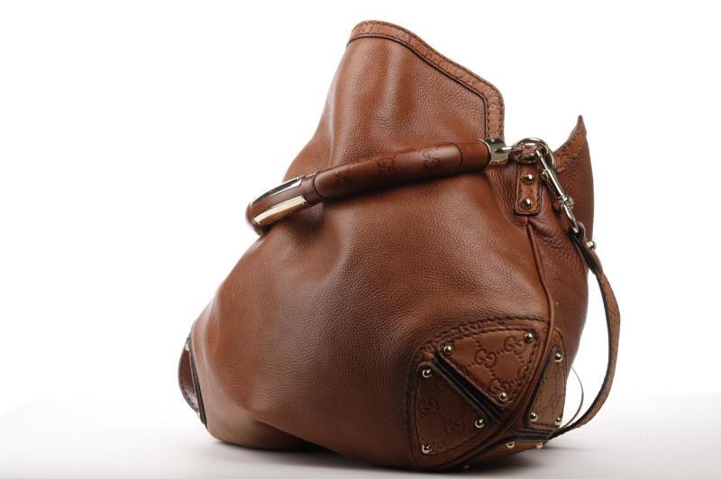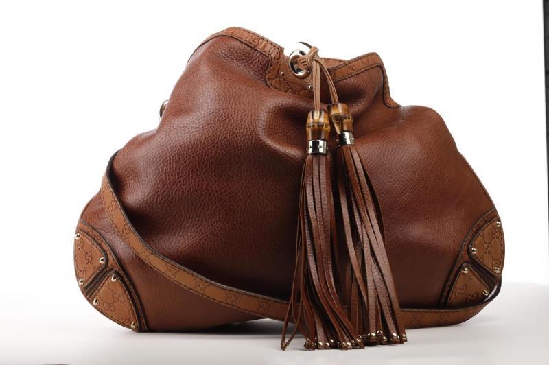This Gucci top handle bag is crafted in brown Leather. The GG monogram is crafted on the corners of the bag and the bamboo endorsement on the tassles gives the bag an exotic look. The bag closes without any zip nor buckle thanks to the big tassles. These tassles are finished with a Gold stud. The interior of the bag features two side compartments. It comes with an extra removable shoulder strap with the gucci monogram. This allows you to hang it around easily as well as use it as a cross bag.