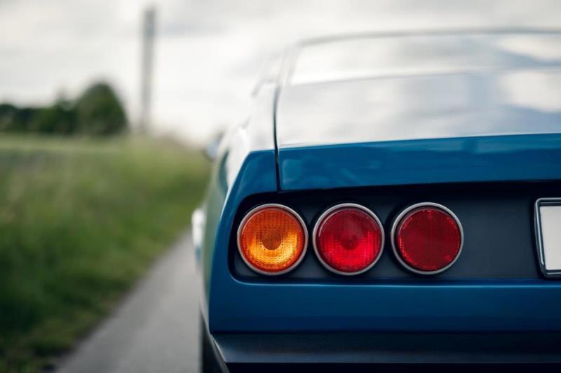 With its wedge shape, the retractable headlights and the five-spoke wheels, the GTC/4 reminded much more of the sporty 365 GTB/4 Daytona and looked way more exotic than its predecessors 365 GTC and 365 GT 2+2. The front end is marked by a matte black synthetic resin noseband that replaces the bumper, and the at that time most modern retractable headlights. Unlike the Daytona the GTC/4 had been designed with the retractable headlights in the first place, so these are fully integrated. The bonnet and the wings run smoothly up to the cabin. The roof line comes down to the low rear end with its pair of triple lights, which in total shapes the characteristic, wedged profile.