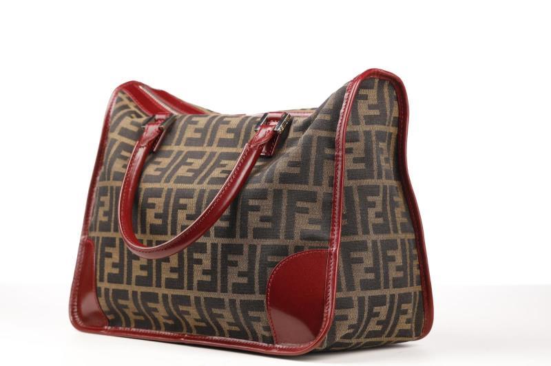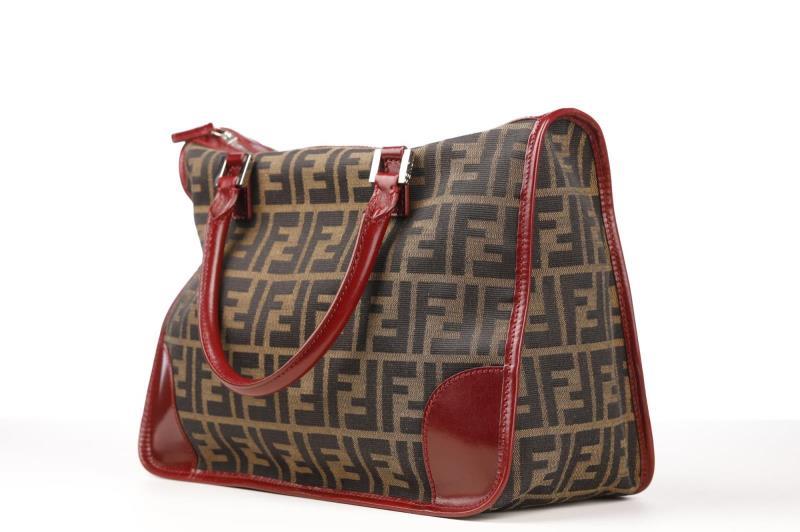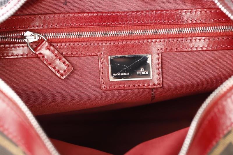 Vintage Fendi monogram Handbag with Leather bordeaux detailing with silver- tone hardware. Zipper closure at top. Inside you have red color textile lining and one zippered storage bag.