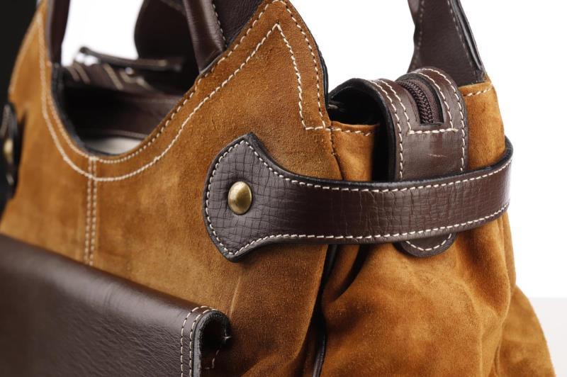 This Classic and stylish shoulder bag is crafted in brown suede, dark brown Leather and features Gold toned hardware. It is a multifunctional bag. On the outside, it has an additional storage compartment. The interior contains three spacious compartments and is made of grey fabric. The middle one has a zipper pocket. Along the inside there is also a small separate zippered storage pocket. All your daily essentials can be stored in this bag.