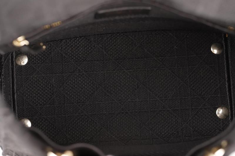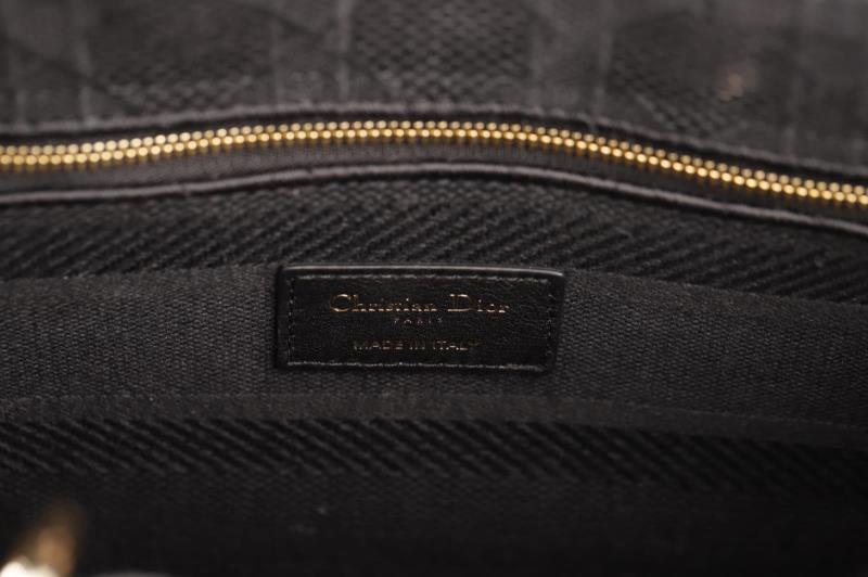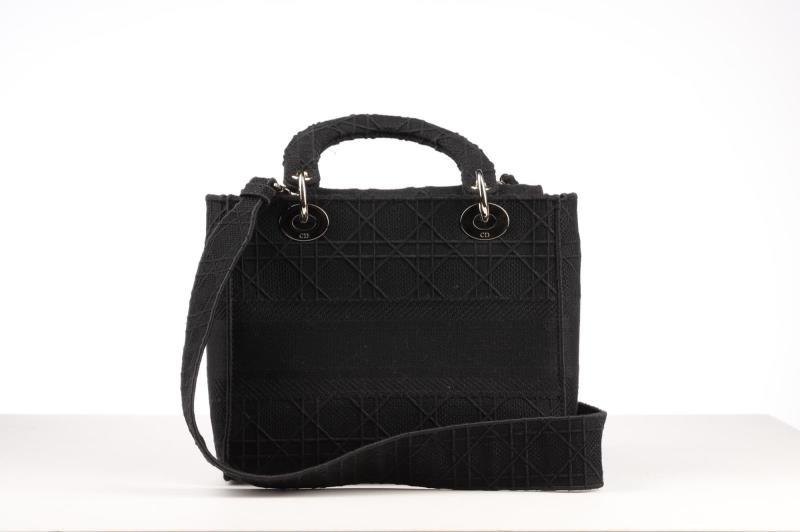 The Lady D-Lite bag exudes the elegance and beauty of Dior. This sleek and sophisticated style is fully embroidered with a black Cannage motif. As well as the 'CHRISTIAN DIOR' emblem on the front, the bag is styled with robust 'D.I.O.R.' charms in shiny Gold-coated metal that add to the appeal of the silhouette. And thanks to the wide, double-sided and removable embroidered shoulder strap, it can be worn in different ways in the hand, over the shoulder or crossbody. Zipped pocket on the inside. Large patch pocket. The bag can be perfectly combined with various embroidered straps.