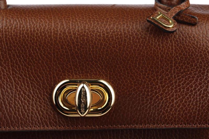 he exterior is made out of beautiful brown Leather which gives it that hint of luxury that Delvaux adores. This beautiful round model opens and closes with a Gold-coloured turn lock with the name Delvaux on it. There is also a small D on the handle. Inside the bag is fagewrrkt with brown suede and has a storage compartment that can be closed with a push button.
