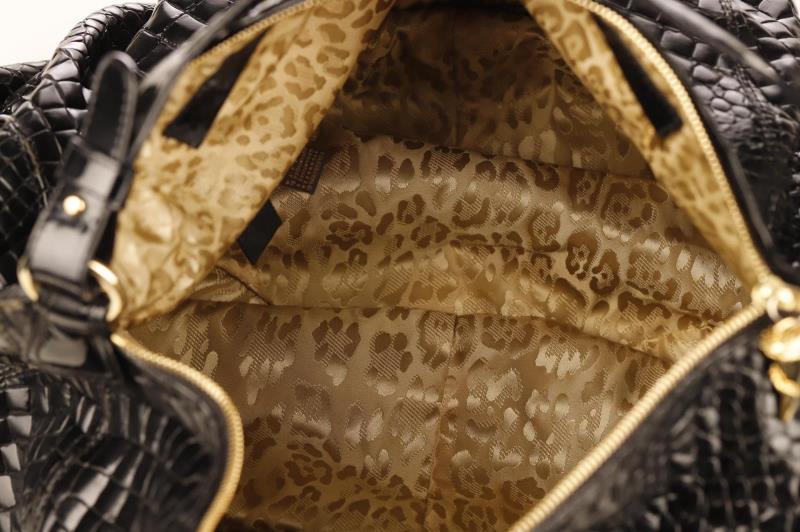 This Roberto Cavalli crocodile embossed bag can be transformed from a medium size bag to a large shoulder bag by unlocking the clasp. The bag has gold hardware and has a tooth pendant on the zipper. The expandable and spacious interior is in beige leopard fabric and has a side pocket to store your essentials.