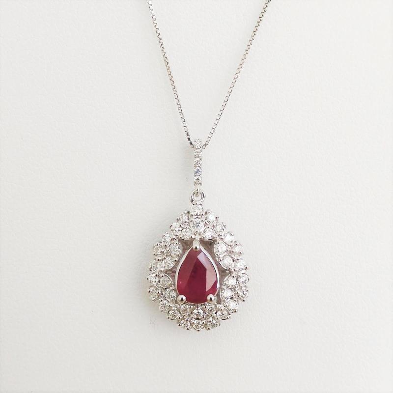 With AIG Certicate No. 183000246BE - Material: 18 kt. White Gold - Gross Weight: 4.40 grams - Measurements: Necklace: 400 Pendant: 27x14x6 mm Main Stone: Ruby - Shape: Pear Mixed Cut - Total Carat Weight: 1.06 cts. - No. of Stones: 1 - Color Grade: Deep Purplish Red - Treatment: Indications of heating present Side Stones: Diamond - Shape: Round Brilliant - Total Carat Weight: 0.59 cts. - No. of Stones: 42 - Color Grade: F - Clarity Grade: VS-SI - Treatment: Natural (untreated) - Made in Belgium - Estimated Retail Value: EUR 2460 Notes: - Natural gemstones and diamonds often have inclusions. Gemstones and diamonds are commonly treated to enhance colour or clarity. This has not been researched for this item unless otherwise mentioned. The diamonds have not been specifically tested whether they are naturally mined or lab grown unless otherwise mentioned. - Please note that some of the images are zoomed in. Please refer to the measurements for actual size Shipping and Delivery information: - Free insured shipping within the EU with track and trace - Free Ring size change if required - Jewels are shipped in a gift box