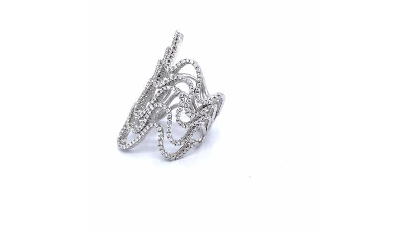 Fancy Wave Diamond Ring white gold, Ring size 53 (adjustable) with 300 diamonds mounted on 5 rows. Total carat weight of diamonds 1,44 cts and total Ring weight 10,817 grs.
