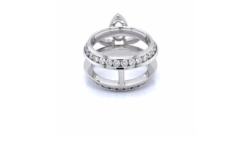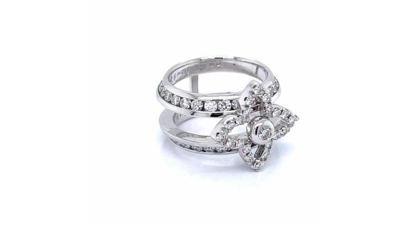 Fancy Flower Diamond Ring platinum double row , Ring size 52 with 21 brilliant diamonds on flower and 1 central brilliant diamond 0,05cts . 28 brilliant diamonds on each row of approx 0,04 cts each. Total carat weight of diamonds approx 2,37 cts and total Ring weight 12,698 grs. Inscription in Ring "16485".