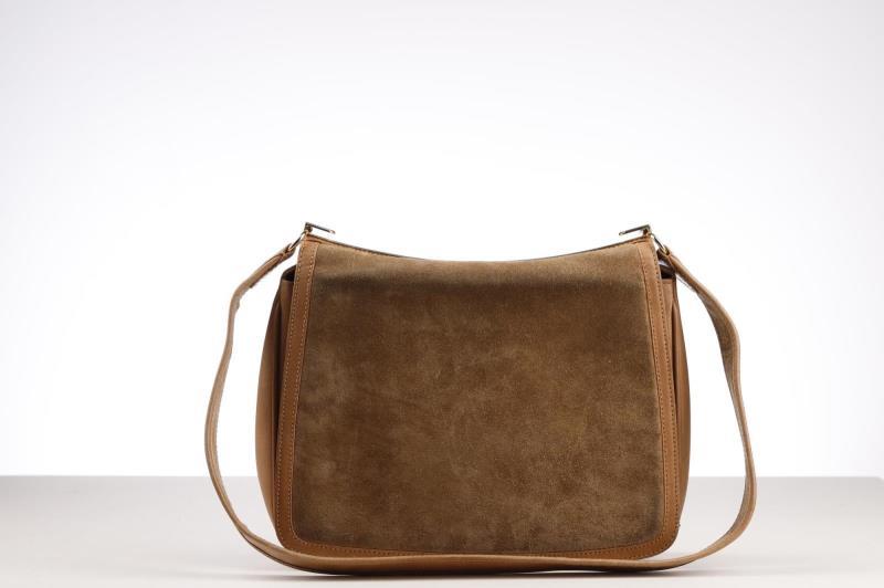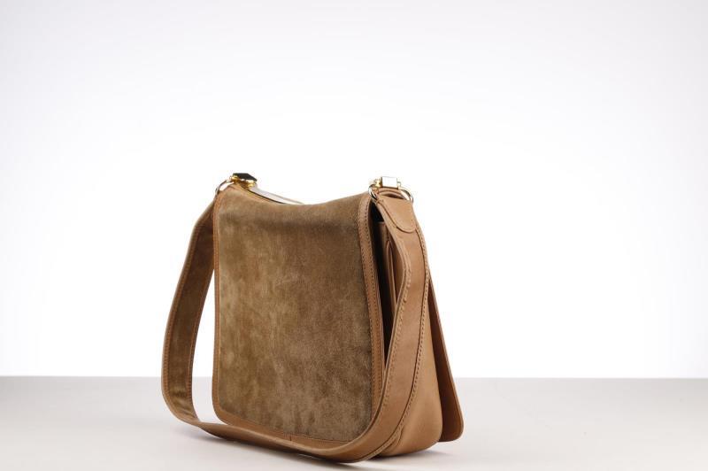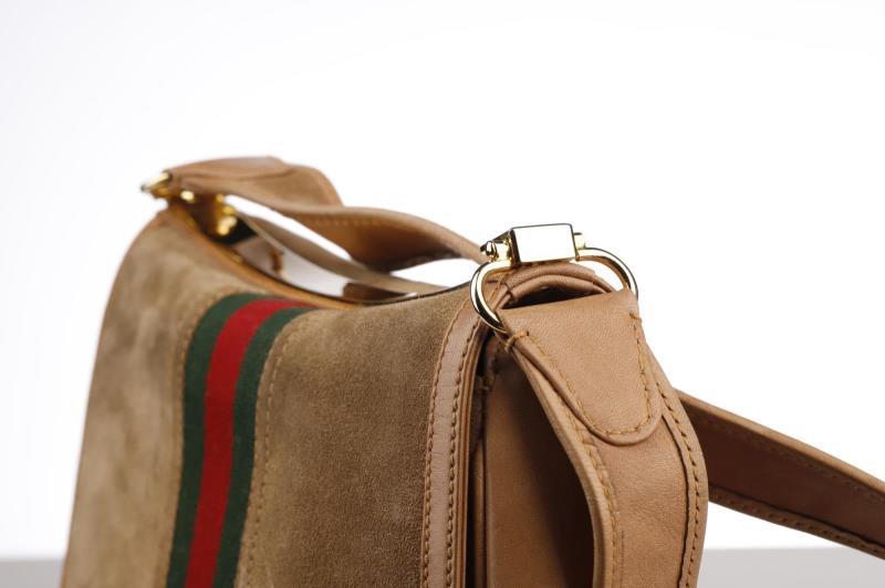 This vintage Gucci cognac shoulder bag has canvas strap in green red. This bag consists of dein and is finished in Leather. It has a Gold harwdare and you can close it with a slide lock. Inside it has cognac Leather and several storage compartments including one with zipper closure. The shoulder strap is 70 cm long and is also removable.